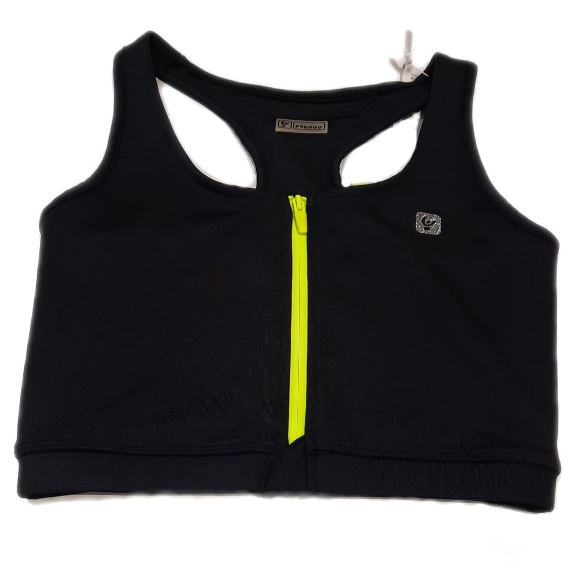 Freddy TOP bra/corpetto palestra donna zip con apertura sul davanti HIGH SUPPORT D.I.W.O. nero/giallo fluo